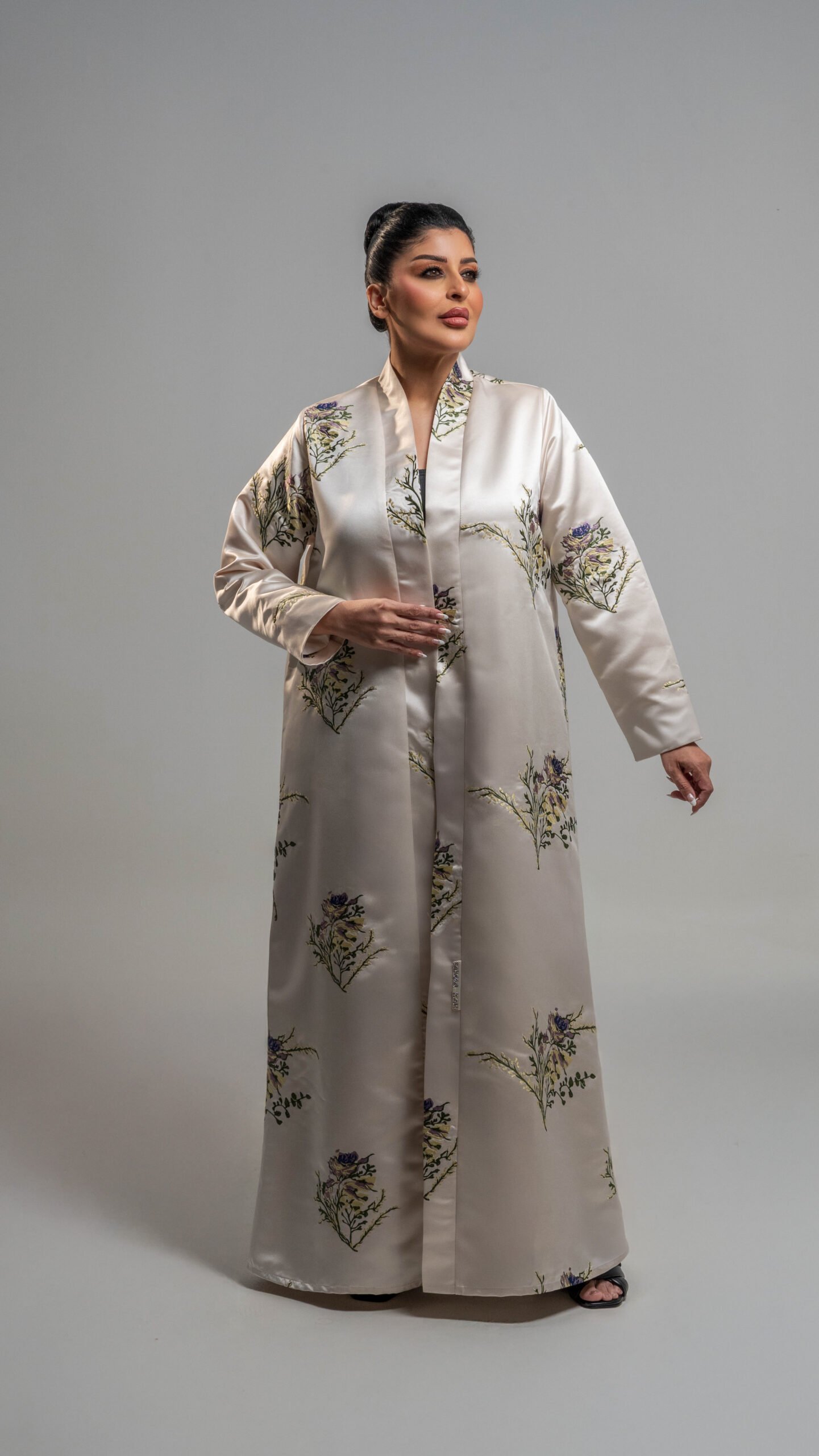 عباية ستان بيج من القماش الساتان مطرز بالخيط الملون و القماش الفرو مطعم بالخرز الاسود شنطه ستان مطعمه ب الخرز الاسود F1A
