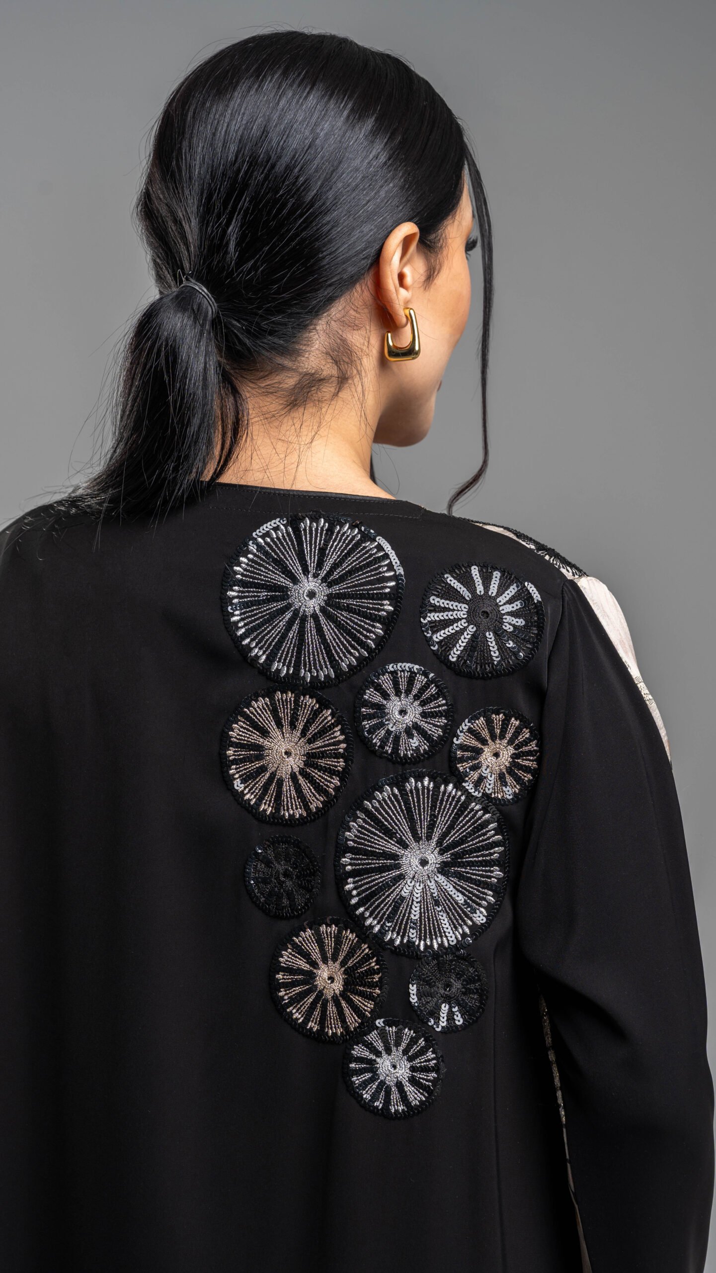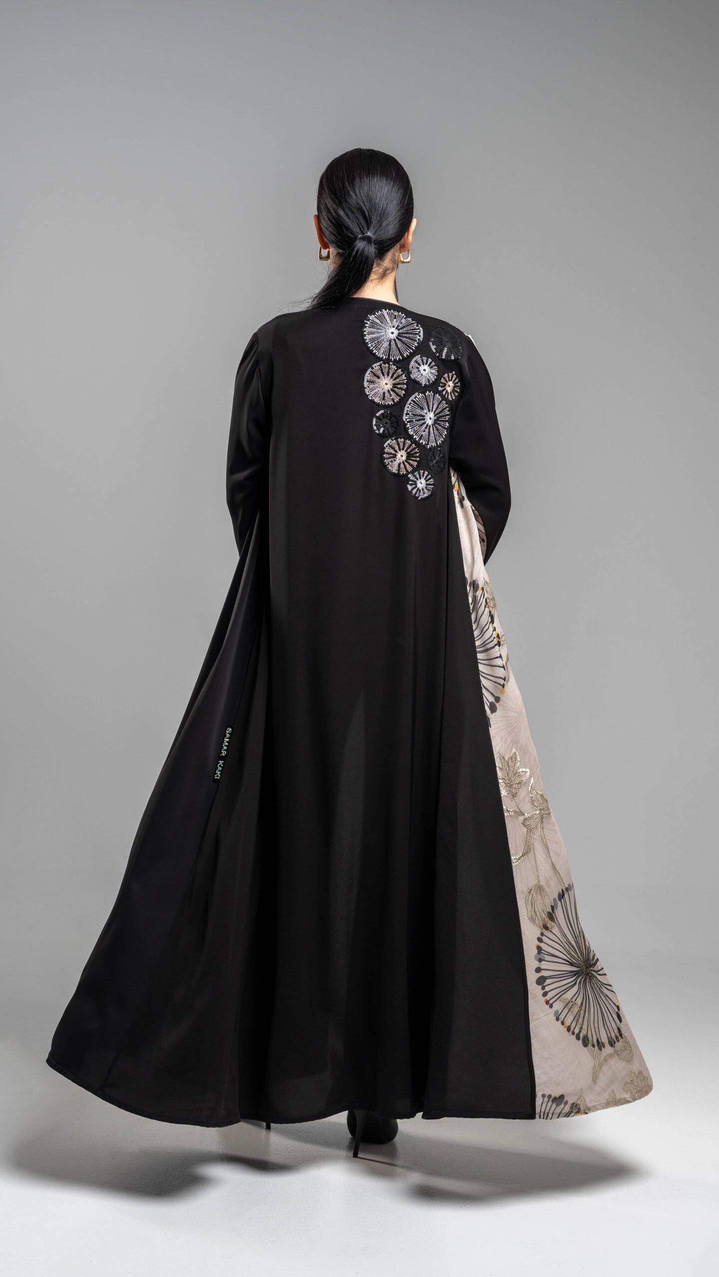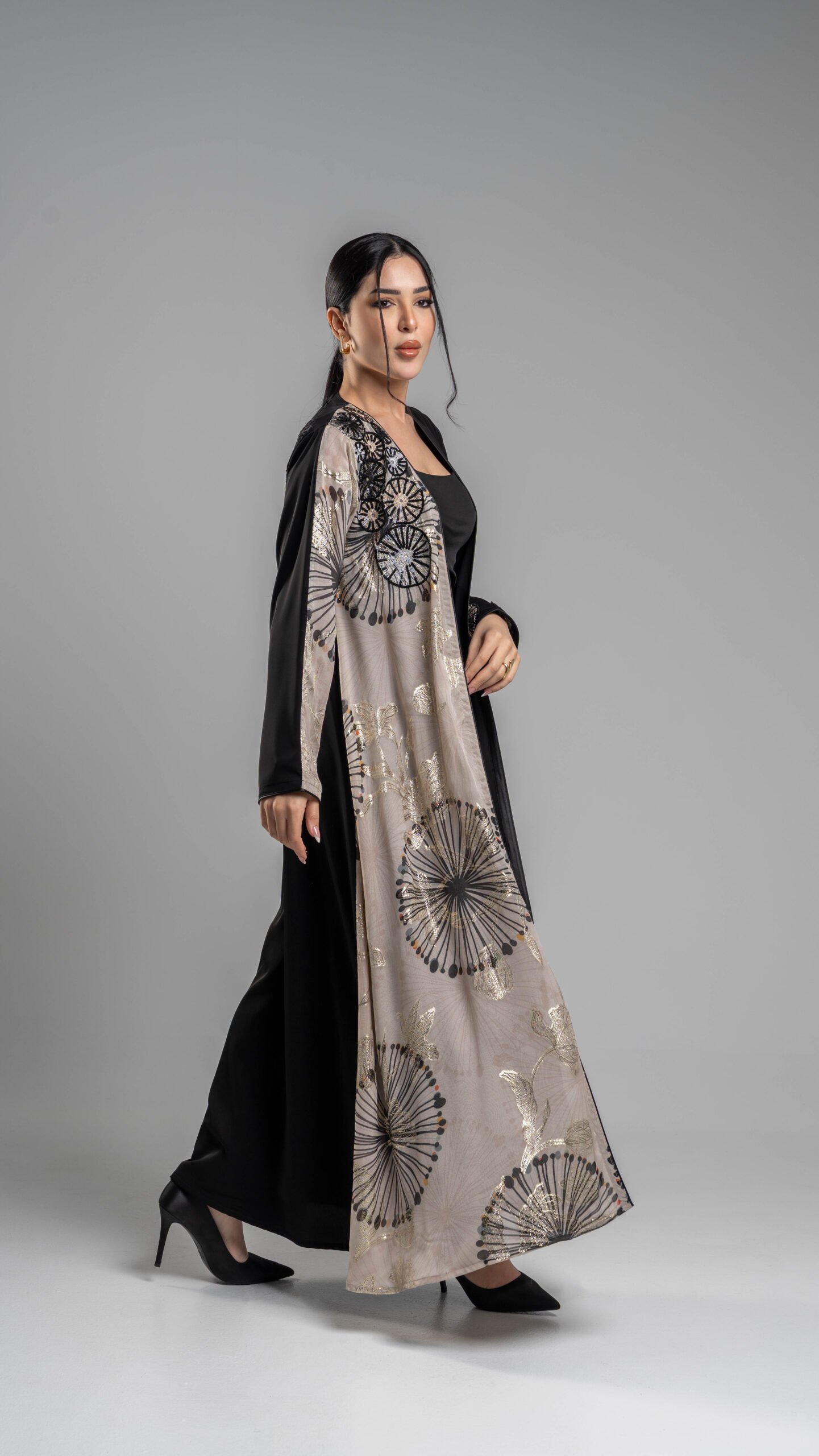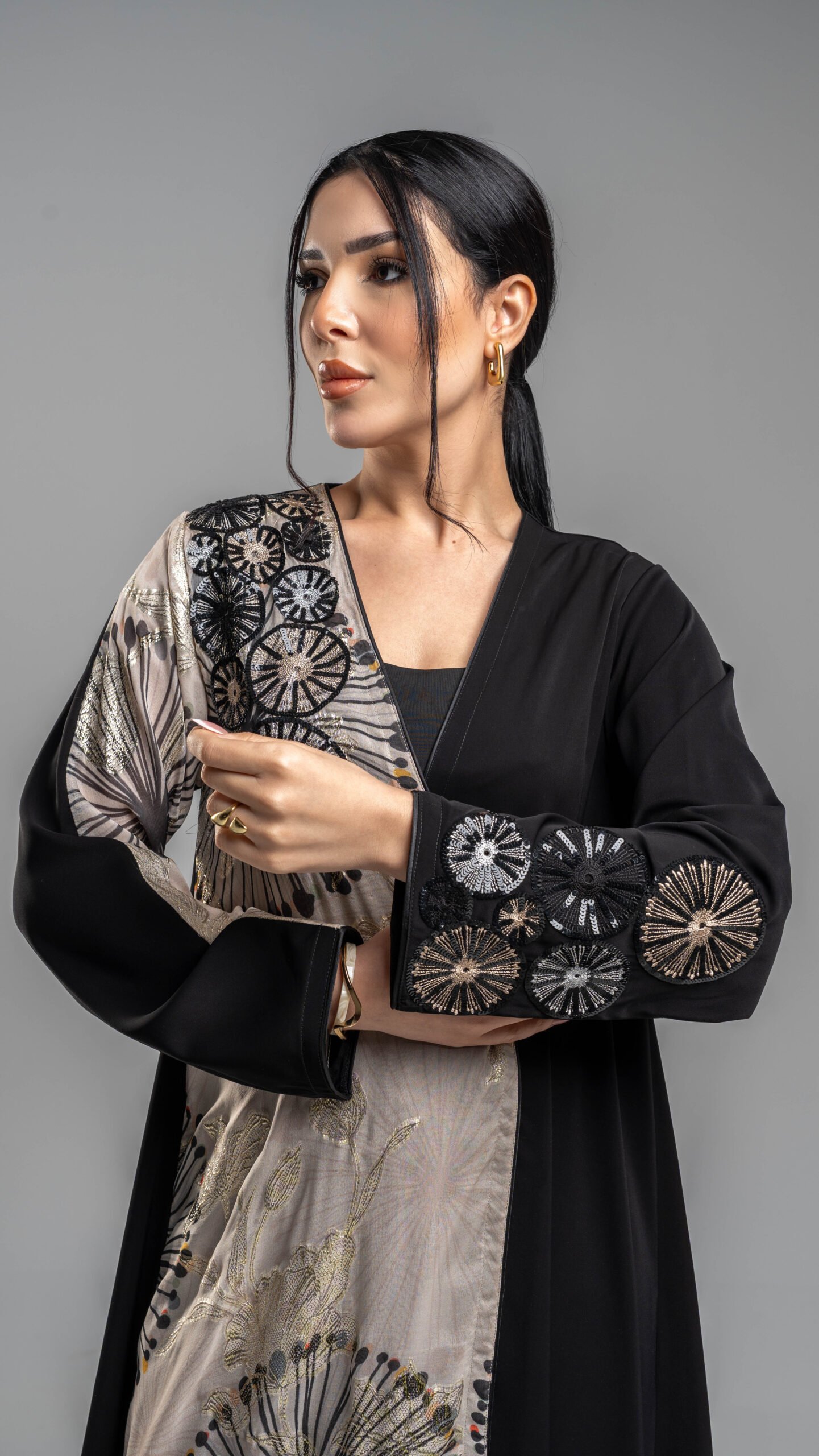 عباية ناعمه بارده و فاخره في نفس الوقت .تجمع اللون الأسود الحرير مع قطعة جانبيه حرير مشجره باللون ( ذهبي رملي و اسود ) .تطريز مميز على الاكتاف و اليد أنيق و فخم يمنحك إطلاله تناسب المناسبات الخاصه ( رمضانيه – عيد – زيارات ) .كود : RD2