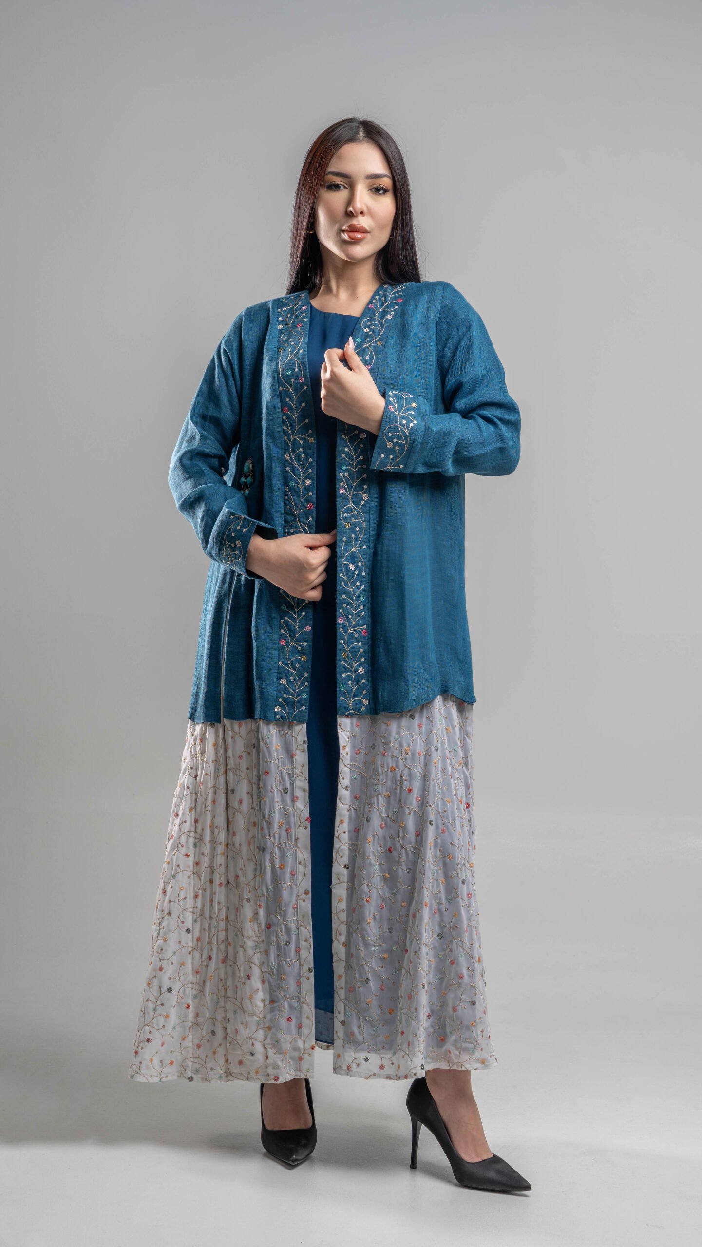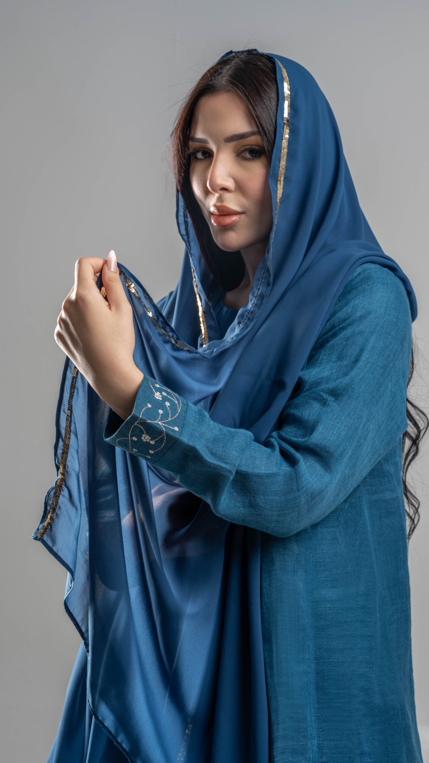 عباية فاخرة باللون الأزرق البترولي، مصممة بقصة راقية و تطريز أبيض على الأطراف مع اكسسوار جانبي يزيد التصميم تميزاً.