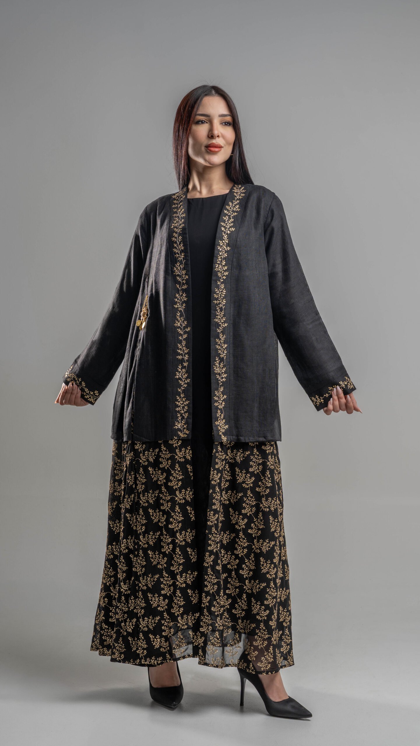 مزيّنة بتطريز ذهبي ناعم على الأطراف مع اكسسوار جانبي يضيف لمسة تميز وفخامة.