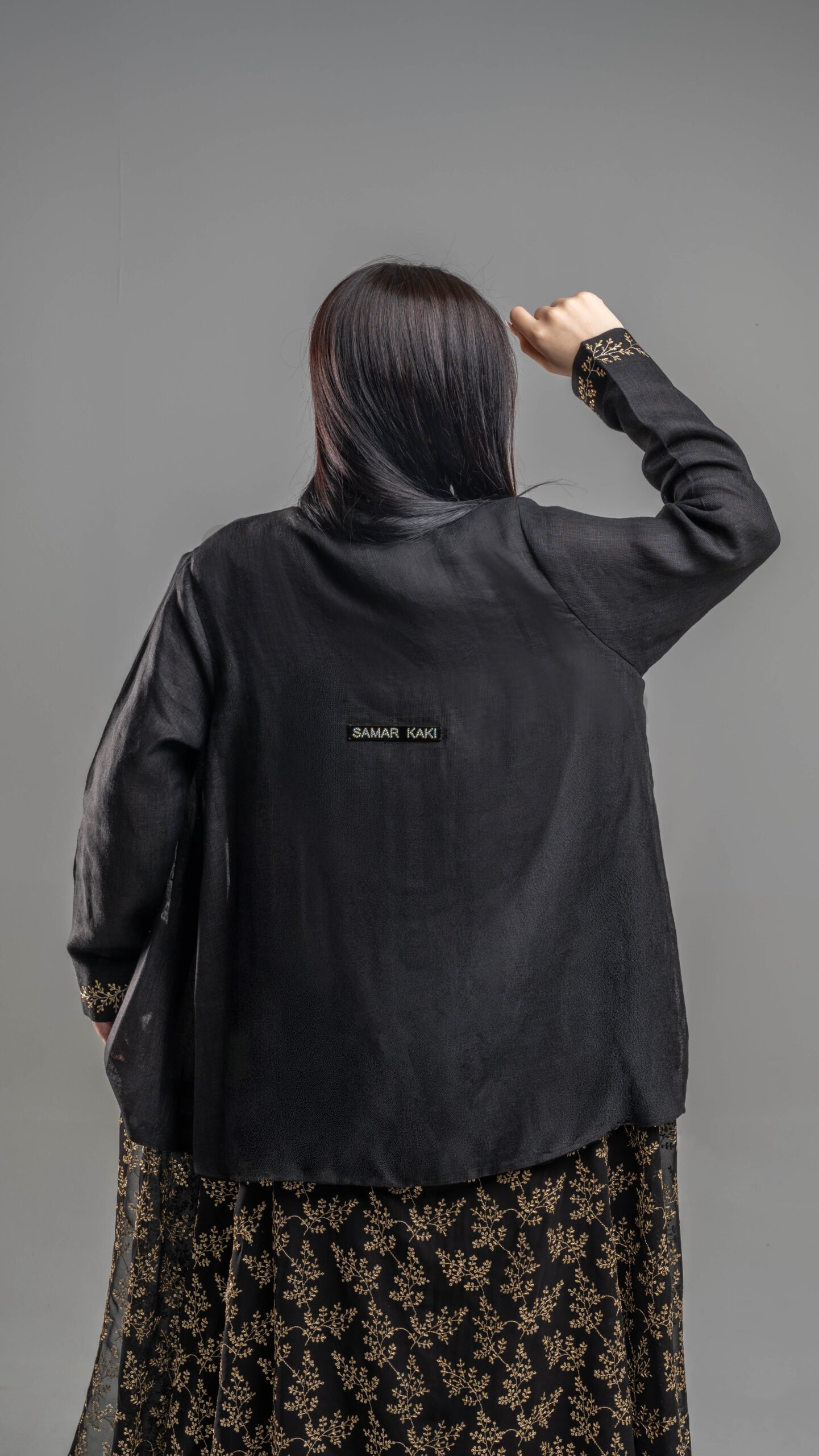 الخامة مزيج من قماش اللينن البارد مع شيفون مطرز خفيف،