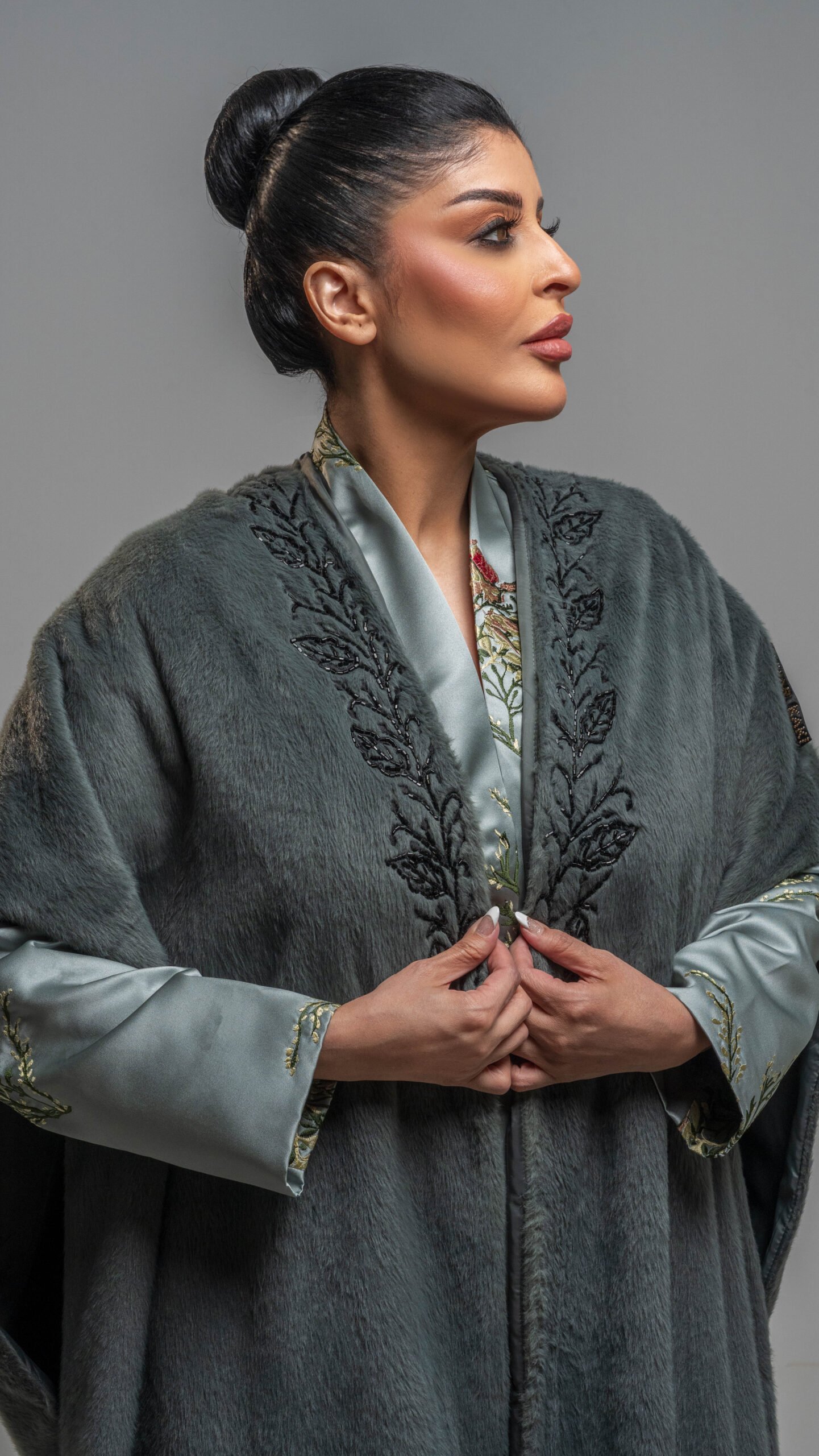 Metallic GrayMade of satin fabric embroidered with multicolored threads,and faux-fur fabric embellished with black beads.Includes a satin bag adorned with black beads.F2”